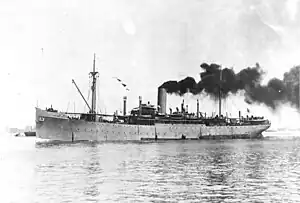 After her naval decommission, Santa Olivia entered merchant service on or before September 1919[19] as a cargo ship for W. R. Grace & Co., under the name SS Santa Olivia. For the next few years, the ship operated between New York and various ports in South America, including Rio de Janeiro, Brazil;[19] Valparaiso, Chile;[20] and Callao, Peru.[21] In August 1920, Santa Olivia collided with and sank a tug at Callao, with the freighter suffering minor damage.[22] In July–August 1922, Santa Olivia delivered 3,500 tons of grain to Reval (modern day Tallinn), Estonia, as part of a relief mission to famine-stricken regions of Russia.[23][24]