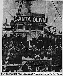 Santa Olivia's final round trip to France for the navy began with a departure from New York on 15 June.[12] At Bordeaux, Santa Olivia embarked another 45 officers and 1,814 men, returning them to New York on 9 July. During this voyage, the ship experienced some rough weather causing a planned onboard Fourth of July celebration to be postponed until the 6th, while two soldiers and one sailor were confined after showing "signs of insanity"; the three men were later transferred to a military hospital for observation.[13] Santa Olivia was the last U.S. troopship to depart from Bordeaux, the port subsequently being abandoned as a U.S Navy embarkation point in favor of Brest.[13] In her four troop repatriation missions, Santa Olivia returned a total of 7,491 officers and men to the United States, including 14 sick or wounded.[14] On 21 July, Santa Olivia was decommissioned at the Grace Line Pier, Brooklyn, and returned the same day to her owner, W. R. Grace & Co.[1]