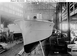 ![]() Seatag as a civilian motorboat, photographed in a boat shed probably around the time of her completion in 1917. | |