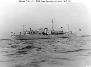 Shrewsbury was built in 1910 by George Lawley & Son at Neponset, Massachusetts, as the private motorboat Mona. In private use, she subsequently was renamed Gipsy (according to one source),[5] then Topsy. She had been renamed Shrewsbury by the time the U.S. Navy acquired her from her owner, N. H. McCarter of Newark, New Jersey, on 13 April 1917 for World War I service. She was commissioned as USS Shrewsbury (SP-70) on 23 April 1917.