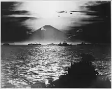 As Lee's task group approached Guadalcanal, his Japanese counterpart Admiral Nobutake Kondō steamed to meet him with his main bombardment force, consisting of the fast battleship Kirishima, the heavy cruisers Takao and Atago, and a destroyer screen. While en route, TG 16.3 was re-designated as TF 64 on 14 November; the ships passed to the south of Guadalcanal and then rounded the western end of the island to block Kondō's expected route. Japanese aircraft reported sighting Lee's formation, but identification of the ships ranged from a group of cruisers and destroyers to aircraft carriers, causing confusion among the Japanese commanders. That evening, American reconnaissance aircraft spotted Japanese warships off Savo Island, prompting Lee to order his ships to general quarters. The four destroyers were arrayed ahead of the two battleships.[16] The American task force, having been thrown together a day before, had not operated together as a unit, and both of the battleships had very limited experience shooting their main battery, particularly at night.[12]