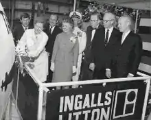The contract to build Tautog was awarded to Ingalls Shipbuilding in Pascagoula, Mississippi, on 30 November 1961 and her keel was laid down there on 27 January 1964. She was commissioned on 15 March 1967, sponsored by Pauline Lafon Gore, wife of United States Senator Albert Gore, Sr. (1907–1998) of Tennessee.[1] Under sunny skies, a crowd of thousands watched as Mrs. Gore took a hearty swing with a bottle of champagne and intoned the memorial words, "In the name of the United States of America, I christen thee Tautog." Tautog was commissioned 17 August 1968 under the command of Commander Buele G. Balderston.[1]