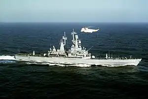 On 11 August 1983, anti-nuclear activists marched in Wellington, New Zealand in opposition to a port visit there by Texas. The anti-nuclear movement in New Zealand objected to the US policy of not publicizing which of its ships carried nuclear weapons.[5] Texas visited the Town of Albany, Western Australia, anchoring in King George Sound on 29 August 1983 for an R&R visit. She departed on 1 September 1983, returning to San Diego.[6] She then began to make preparations for a homeport change to Alameda, California then went north to Bremerton, Washington, for a Complex Overhaul. She entered dry-dock at Puget Sound Naval Shipyard in September, and remained there until April 1987.