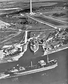 Following overhaul, Texas resumed duty with the Atlantic Fleet early in 1919. On 10 March, she became the first American battleship to launch an airplane when Lieutenant Commander Edward O. McDonnell flew a British-built Sopwith Camel off the warship at Guantanamo Bay. Later in 1919 Texas's captain, Nathan C. Twining, successfully employed naval aircraft to spot the fall of shells during a main battery exercise.[33] The results were that aircraft-borne gunfire spotters were significantly more accurate than shipboard spotters. In testimony to the Navy General Board, Lieutenant Commander Kenneth Whiting attested that the increase in gunfire effectiveness with air spotting was likely to be as great as 200%.[34] As a result of these first experiments, the Navy would add floatplanes to all of the fleet's battleships and newer cruisers.[35] In May 1919, Texas served as a plane guard and navigational aid for the successful attempt by Navy Curtiss NC flying boat NC-4 to become the first airplane to cross the Atlantic.[6] On 26 July 1919 Texas entered the Pacific Ocean as part of the newly formed Pacific Fleet and she would spend the next five and half years as a part of Pacific Fleet.[36] On 17 July the following year, she was designated BB-35 under the Navy's newly adopted alpha-numeric system of hull classification symbols.[7]