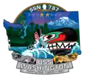 The crest contains images including Mount Rainier, the Seattle skyline, evergreen trees, and silhouettes of the previous two USS Washingtons.