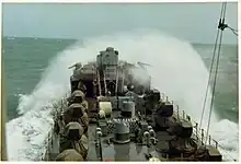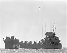 USS White River (LSMR-536) (later LFR-536) was a Landing Ship Medium (Rocket) (LSMR) in service with the US Navy between 1945 and 1946, 1950 and 1956, and 1965 and 1970. As a member of the LSM(R)-501-class Landing Ship Medium (Rocket), White River was designed to provide rocket fire support to US and allied amphibious operations, although in South Vietnam she was generally used to bombard enemy formations and installations.[2] She saw combat in the Korean and Vietnam Wars, making a large contribution to the latter, in which she fired tens[3] to hundreds of thousands[4] of rockets in support of American, South Vietnamese, and South Korean operations against the Viet Cong[4][5][6] during ten tours of duty in Vietnam, 1966 through 1969.[7] In Navy publications such as All Hands and the Navy Times, as well as in the recollections of crew, forward observers and spotters, and ground forces receiving her support, White River was reported to have the firepower of six destroyers[4][8] or a cruiser.[9] She could fire 250 65-pound (29 kg) rockets in a minute, plus 5-inch shells and autocannon fire, and carry a magazine of 1,500-2,000 rockets.[4][7]