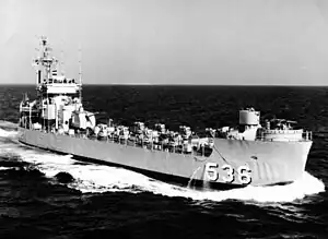 The unnamed medium landing ship (rocket) LSMR-536 was laid down on 9 June 1945 at Houston, Texas, by the Brown Shipbuilding Company; launched on 14 July 1945; and commissioned on 28 November 1945.[12]