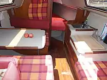 In a 2010 review Steve Henkel noted the wide four seat dinette table, which can be converted into a double berth. He listed the full keel version's worst features, in comparison to its competition, as, "the draft is a little high, the ballast a little low, and the headroom low, too."[3]