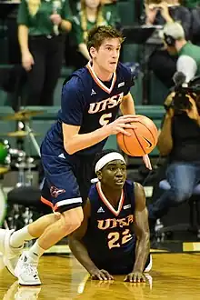 The UTSA Roadrunners men's basketball team represents the University of Texas at San Antonio in San Antonio, Texas, US in NCAA Division I as a member of the American Athletic Conference (The American) from the 2023–24 season.[2] Originally competing as an NCAA independent in 1981–82, the Roadrunners moved to the Trans-America Athletic Conference (now known as the ASUN Conference) in 1986–87, then moved to the Southland Conference in 1991–92,[3][4] then moved to the Western Athletic Conference in 2012–2013,[5] then moved to Conference USA in 2013–2014[6] where they remained for the next 10 seasons. UTSA plays its home games at the on-campus Convocation Center, and is coached by former NBA player Steve Henson.