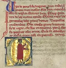 His origins are found in Penne-d'Agenais, in the Rouergue.[1] According to his vida his birthplace was a castle called "Messat" or "Monmessat".[1] He was the son of a merchant, who first became a jongleur and then grew renowned for his singing and for his expansive repertoire (of the works of others).[1] He was also reputed for his knowledge of the "great men of those regions", but he was known for his roguish style of living—gambling and frequenting taverns—for which reason, says his biographer, "he was always poor and without equipment."[1] Eventually he travelled east to "Isla é(n) Venaissi" (probably Isle-sur-Sorgue in Provence), where he married.[1]