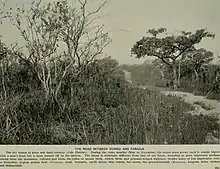 Rubber was harvested in the Uele District, and taken to the port of Bumba for storage and transport by river to Bas-Congo.[21] A single Catholic mission was established at Gombari on the Bomokandi River.[22] The administration responded to an epidemic of sleeping sickness that began in 1904 in the Congo Free State with measures that had been proven against cholera and plague in Europe. Between 1904 and 1914 they placed those who were infected or suspected of being infected in isolation camps or lazarets, and mapped out the zones of infection. Many of the local people in Uele District saw the health campaign as another aspect of the program of conquest and exploitation.[23] The director of Ibembo lazaret made several proposals between 1907 and 1912 for a program to contain sleeping sickness in the "great uninfected triangle" of the Uele. The military campaign against Sasa,[lower-alpha 1] the powerful leader of the Azande, exposed the true extent of the disease. It was found that sleeping sickness was widespread in the north of Uele District.[25] The district was to have been opened to free trade in July 1912, and flooded by mineral prospectors, traders and their porters.[26]