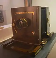 It was only after his contact with Swiss photographer Pierre Rossier (1829 – ca. 1890) that Ueno decided to pursue a career as a photographer. Rossier had been commissioned by the firm Negretti and Zambra to photograph in Asia and he worked in Japan from 1859 to 1860. He was only in Nagasaki for a short time, but while there he taught wet-collodion process photography to Ueno, Horie Kuwajirō (1831–1866), Maeda Genzō (1831–1906) and others. Soon after, Ueno's friend Horie bought a wet-plate camera. The purchase, which included photographic chemicals, was funded by the daimyō of Tsu Domain, Tōdō Takayuki, and the price was 150 ryō. Apparently the photographic equipment was of such interest to Ueno that he chose to become a subject of the Tsu Domain in order to have access to it at the domainal residence in Edo.[3] and in 1861 Horie photographed Ueno at work in the domain's laboratory in Edo (now Tokyo).[4] In 1862 Ueno and Horie co-wrote a textbook titled Shamitsu Kyoku Hikkei that comprised translated extracts from ten Dutch science manuals and which included an appendix titled Satsueijutsu [The Technique of Photography] that described techniques of collodion process photography as well as Nicéphore Niépce's asphalt printing method.[lower-alpha 5][4]