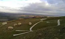 The most significant nearby feature is the Iron Age Uffington Castle, located on higher ground atop a knoll above the White Horse.[21] This hillfort comprises an area of approximately 3 ha (7.4 acres) enclosed by a single, well-preserved bank and ditch. Dragon Hill is a natural chalk hill with an artificial flat top, associated in legend with St George.[22]