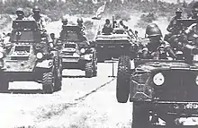 On 23 January 1964, the 1st Battalion mutinied following similar mutinies in Kenya and Tanzania.[17] The soldiers were upset about the conditions of their service, and the slow progress of Africanisation in the officer corps. When Minister for Defence Felix Onama met with the mutineers to discuss their demands, they manhandled him and locked him up until he agreed to support their demands in the cabinet.[18] The Ugandan government was only able to put down the mutineers with British assistance in form of the Scots Guards and Staffordshire Regiment.[17][18] Regardless, the government agreed to meet the soldiers' demands, including an increase in pay as well as the Africanisation of the officers. As a result of the latter agreement, Idi Amin was appointed commander of the 1st Battalion,[17] while Shaban Opolot was made Army Commander.[19] The mutiny also strongly impacted national politics, as Obote's government increasingly viewed the military as a potential threat as well as asset. In April 1964, the General Service Unit (GSU) was set up as a militarised intelligence agency and bodyguards to protect the government from civilian and military threats.[17][20] The GSU was almost entirely composed of Langi.[12] In addition, Obote decided to not only africanize the officer corps, but also reduce cooperation with the British military in general so that the latter had less leverage in Uganda.[20] In late July 1964, the British Army completely withdrew from the country, while cooperation with Israel was increased to set up armoured forces well as an air force for the Uganda Army.[17][21] The de facto success of the mutinies also proved very harmful to the UA soldiers' future discipline.[18]