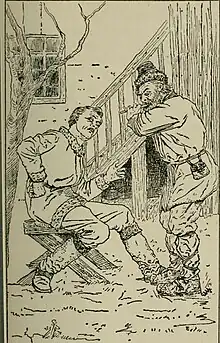 Characters in Ukrainian fairy tales often feature warriors, princes, and peasants.[5] Common features of narrative transition in Ukrainian kazky include mediators (objects, actions, notions, events, or conditions), magic helpers (objects, things, or supernatural beings), and triggers (signs or prohibitions).[6] These elements perform a linking function in the narrative and provide motivation for the main character to move from one setting to another.[6]