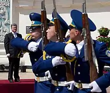 The new president then signs the text transfers it over to the chairman of the Constitutional Court after conducting the oath.[1] The performance of the Molytva za Ukrainu (Prayer for Ukraine) will then follow. The president will then receive state symbols and heraldry, including the seal, the collar and bulava of the president of Ukraine. Once this is done, the president will deliver a speech that will be given in the Ukrainian language, although on some occasions Russian has been used throughout the speech. After the speech, the swearing-in-ceremony is declared closed and the president walks to the nearby Mariinskyi Palace to take the salute as supreme commander-in-chief of the Armed Forces of Ukraine. This formal military ceremony has also been known to take place at the Office of the President on Bankova and in 2014, on Sofia Square. During the ceremony the president receives the salute of the commander, Kyiv Presidential Honor Guard Battalion who reports the following: