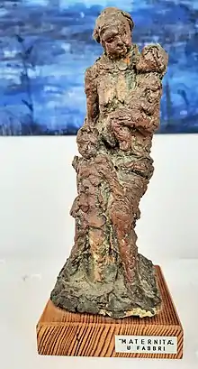 He was the author, in the early thirties of the twentieth century, of some of the marble busts placed in the Shrine of Fascist Martyrs (Paolo Accorsi, Franco Gozzi, Rino Moretti) placed in the then new headquarters of the Casa del Fascio, along with colleagues Giuseppe Virgili, Enzo Nenci, Antonio Alberghini, Laerte Milani and Gaetano Galvani.[1] He sent his works to the International Exhibition of Sacred Art in Padua in 1931, to the Primaverile in Florence in 1933, to the Venice Biennale in 1936. In 1937 his sculpture Giovinetto is acquired by the Gallery of Modern Art in Milan. In 1938 he made the marble bust of Marshal Emilio De Bono of Italy, which was originally in Corte Delle Vittorie in Rome and is now in storage at the Casa Made Dei Mutilati in Rome. Other sculptures of his in Ferrara: the terracotta panels of the Via Crucis, in the Gran Claustro of the Church of San Cristoforo alla Certosa; Il Genio dell'arte, bronze sculpture on the facade of the Conservatorio Girolamo Frescobaldi (1930); the Fontana Narciso, in gilded bronze, at the Chamber of Commerce of Ferrara (1964); the neo-fourteenth-century Busto di Madonna, in terracotta, now owned by BPER (1946). The clay group of Ecce Homo (Ferrara, private collection)[2] is originally resolved from the iconographic point of view, as well as Salvamento, terracotta of 1953, currently at the Cavallini-Sgarbi Foundation of Ro Ferrarese.[3]