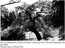 The journal Nature reported in July 1918 "a remarkable elm of the variety known as Ulmus serpentina, apparently about sixty years old, vigorously growing in a Croydon garden".[22] "Sixty years old" would pre-date the first known reference to a 'Serpentina', but would tally with an early 'Camperdownii' planting. Späth's U. montana serpentina was planted at Kew in 1896. Henry, though he describes Kew's 'Serpentina', calling it "U. major var. serpentina Henry", makes, unusually, no mention of a Kew 'Camperdownii'. Späth's U. montana serpentina was planted in 1897 at the Dominion Arboretum, Ottawa, Canada, which, though it contained some eighty elm cultivars by the turn of the century, had no specimen labelled 'Camperdownii'.[24] Three specimens supplied by the Späth nursery to the Royal Botanic Garden Edinburgh in 1902 as U. montana serpentina[25] are now assumed by the Garden to have been 'Camperdownii',[26] the Garden having no separate accession record for its 'Camperdownii', a sizeable tree by the 1970s (felled in the 1980s).[27] A specimen of U. montana serpentina obtained from Späth before 1914, and planted in 1916, stood in the Ryston Hall arboretum, Norfolk,[28] in the early 20th century.[29] A 1920 photograph taken at Hortus Botanicus, Leiden, showing a weeping tree, is captioned Ulmus scabra [: U. glabra Huds.] Serpentina.[30] Its identification by the arboretum as a wych cultivar points to Camperdown Elm.[31]