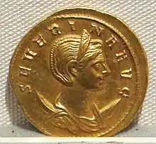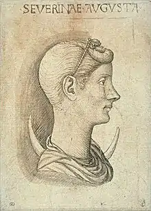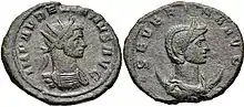 It is not known when she married Aurelian,[2] possibly it was before he became emperor,[4] and nothing is known of her role as empress and her political influence.[5] The only reliable evidence in regards to Severina at all is a scant number of inscriptions and coins, which confirms that she was Aurelian's wife and that she held the title of Augusta. Only two known coins omit the title Augusta, instead styling her as Pia. These were probably minted before she was made Augusta.[6] In full, the coins title her as domina Ulpia Severina Augusta, mater castrorum et senatus et patriae ("lady Ulpia Severina Augusta, mother of the camp, the senate and the fatherland").[2][3][7] Some inscriptions also style her as Piissima Augusta (pious Augusta).[7] Severina also appears to have been deified, as some coins style her as diva.[3] No coins styling Severina as Augusta can be dated before 274 and it is possible that she was not made Augusta until the autumn of that year,[5][7] perhaps around 29 August,[2] coinciding with Aurelian's triumph celebrating the defeats and reincorporations of the Palmyrene and Gallic empires.[4][5]