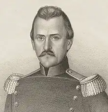 He served as a Feldwebel in the federal intervention in Basel Country in 1833 and was promoted to Unterleutntant in the artillery in 1834.[1] In 1836 he became Lieutenant and was deployed to the Bernese Jura.[1] Two years later, when France threatened a military intervention if Switzerland refused to extradite Louis Napoleon Bonaparte, he was deployed to the french border but Bonaparte eventually prevented a conflict by his voluntary departure from Swiss territory.[1] Ulrich Ochsenbein was a leader of the unsuccessful second Freischarenzug against Lucerne in 1845.[3] Over a hundred people died in the attack and 2000 prisoners were taken by Lucerne.[3] Ochsenbein and Jakob Stämpfli only narrowly managed to escape.[3] Since he was one of the leaders of the campaign against Lucerne, the Tagsatzung expelled him from the General Staff.[4] Following the cantons of Lucerne, Zug, Valais, Schwyz, Fribourg, Uri and Unterwalden created the so-called Sonderbund.[5] In 1847, he lead a military force from Bern against the Sonderbund which then was also defeated in the Sonderbund war.[4]