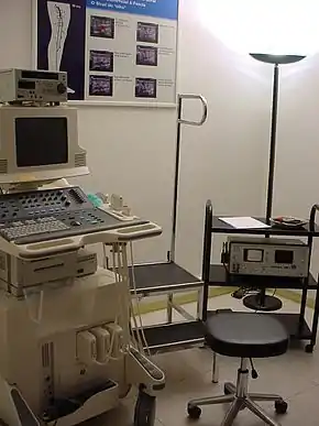 The ultrasound equipment must be of sufficiently high quality in order to give a correct image processing result, which can then provide invaluable information, mainly at the superficial level. It must be able to provide both color and Doppler imaging; technologies that developed alongside the development of ultrasound. The use of Doppler measurements which trace the echoes of the generated soundwaves received by the probe, enable the direction and the velocity of the blood flow, to be depicted. The overlay of color onto the Doppler information lets these images be seen more clearly.[8] The choice of a probe will depend on the depth needed to be studied. For example, the superficial venous system (SVS) can be very well examined using a high frequency probe of 12 MHz. For patients who have thick adipose tissue a probe of 7.5 MHz will be required. Deep veins require probes of around 6 MHz whilst the abdominal vessels are better studied with probes of between 4 and 6 MHz.[9] In summary, three probes are needed together with a top level scanner. Also, the proper use of the scanner calls for a high level of expertise, so that the examiner must be well qualified and experienced in order to give effective results. In contrast to arterial ultrasonography the wall of the vein is not relevant and importance is given to the hemodynamic conclusions that the examiner can obtain in order to provide a valuable report. (Hemodynamics is the study of blood flow and of the laws that govern the circulation of blood in the blood vessels).[5] It follows that the examiner knowledge of venous hemodynamics is crucial, which can be a real barrier to a radiologist untrained in this field, who might wish to carry out these examinations.[10][11] Specialized training in venous ultrasonography is not undertaken in some countries, which undermines best practice, mainly when varicose veins need to be examined.[12]