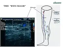 Attention will be focused on the direction of the blood flow in both of the venous systems, and in the perforator veins, as well as being focused on shunt detection.[nb 3][23] A shunting of blood from the thigh veins back into the lower leg veins will give a reflux situation. The veins most often found to be incompetent are the saphenous veins and the perforators communicating with the deep veins of the thigh.[24]
