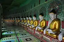 The Umin Thonze Pagoda (Burmese: ဥမင် သုံးဆယ် ဘုရား) is a Buddhist stupa, located in the Sagaing Hills, Myanmar.[1][2] The pagoda was founded by King Tarabya I (r. 1327–1335/36) of Sagaing. It was renovated in 1643 and in 1723.[3] In 1838, the pagoda was essentially destroyed by a major earthquake. King Pagan Min (r. 1846–53) rebuilt the pagoda, completing it in 1847.[note 1] It has a cave with 45 seated Buddha images arranged in a curved formation and behind them decorated with sparkling glass-works.