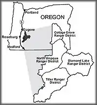 - ↑ Umpqua National Forest from the US Forest Service