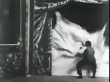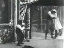 The staging of Porter's version is a bit different from the 1901 version, with a slightly wider frame showing a stage with a box to the left and larger than life characters on the screen while they are lifesize in the 1901 version. Porter's version, to the difference of the 1901 film, includes a title and three intertitles for the three films within the film. The general title The Edison Projecting Kinetoscope is a kind of advertisement for this innovation recently introduced by Edison to replace the Kinetoscope parlors, following the success of the Lumière brothers' cinematograph.