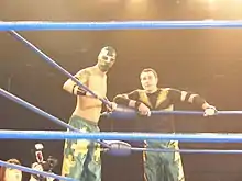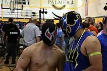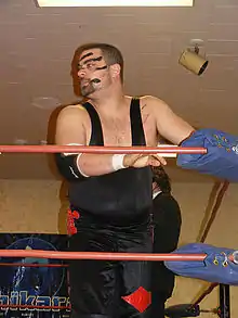 The third match announced was a ten-man tag team match between The Spectral Envoy and the team of Delirious, Kobald, Kodama, Obariyon and Ophidian.[2][3] The rivalry started back in February 2012, when Delirious returned to Chikara and vowed to make UltraMantis Black pay for the two years he lost while being held under the spell of the Eye of Tyr, first by UltraMantis and then by the Bruderschaft des Kreuzes.[21] Though UltraMantis had long since turned tecnico and announced his intention of righting his past wrongs,[22] Delirious was adamant about making him suffer for two entire years as punishment for the years he had lost.[23] During the following months, Delirious aligned himself with Ophidian and The Batiri (Kobald, Kodama and Obariyon) in his rivalry with UltraMantis and his Spectral Envoy stable, which also included Frightmare and Hallowicked.[19][24] Delirious' first goal was to prevent UltraMantis from winning the 2012 King of Trios tournament.[25] The Spectral Envoy faced off with The Batiri in the quarter-finals of the tournament on September 15, which ended with UltraMantis pinning Obariyon for the win.[26][27][28] Afterwards, Ophidian led The Batiri to a post-match assault on the victors.[26][28] During the following day's final match between the Spectral Envoy and Team Ring of Honor (Mike Bennett, Matt Jackson and Nick Jackson), Delirious, Ophidian and The Batiri all came out to interfere, but were stopped by the returning Crossbones, UltraMantis Black's longtime associate. In the end, The Spectral Envoy managed to win the final match, realizing UltraMantis' dream of winning the King of Trios.[29][30] Delirious later explained that his failure to stop the Spectral Envoy was karmic justice caused by his past sins, but now it was time for UltraMantis to face the same justice.[31] The rivalry between the two groups continued on November 10, when Ophidian and The Batiri cost UltraMantis and Hallowicked their match with The Young Bucks (Matt Jackson and Nick Jackson) for the Campeonatos de Parejas.[13][32] Six days later, Chikara announced the "War to Settle the Score" between the two groups. Originally it was announced that for the match, the Spectral Envoy would be represented by UltraMantis Black, Frightmare, Hallowicked and two unnamed members to be revealed later.[33] On November 20, Crossbones was revealed as the first of the two surprise participants.[3] On November 27, Blind Rage was revealed as the final member of the Spectral Envoy.[3] Rage is a Chikara original, who was trained at the Chikara Wrestle Factory and wrestled on the promotion's first ever event on May 25, 2002, as a representative of the rudo stable Night Shift with Hallowicked and Ichabod Slayne (later renamed Icarus).[34] He also teamed with Hallowicked and UltraMantis Black in 2005 as the Dark Breed,[35] and on November 18, 2006, made a one night return as a member of UltraMantis Black's the Order of the Neo-Solar Temple, which turned out to be his final Chikara appearance in over six years.[36]