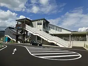 The station consists of two opposed ground-level side platforms connected by an elevated station building. The station is staffed.