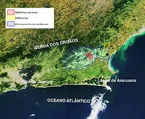 The União Biological Reserve covers parts of the municipalities of Casimiro de Abreu, Macaé and Rio das Ostras in the state of Rio de Janeiro.[1] It is in the Atlantic Forest biome, and covers 2,548 hectares (6,300 acres).[2] Altitude varies from 50 to 350 metres (160 to 1,150 ft). About 58% of the reserve covers the hilly coastal area, with small rounded hills. Another 40% is a more rugged region of ridges and escarpments. There are some small areas of flooded land. The reserve is drained by the basins of the Macaé, São João and Ostras rivers.[1]