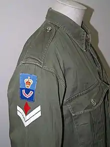 New Zealand committed an artillery regiment and a company from RNZASC in the Korean War. New Zealand uniforms were basically the same as other participating Commonwealth forces, as all Commonwealth forces served in the British 1st Commonwealth Division. British, Canadian, New Zealand, and South African forces entered the war wearing World War II-style battle dress with different headdress, such as berets, forage caps, and slouch hats to distinguish each other.[17] Australia never adopted British Battle dress during World War II but did eventually adopt it later in Korea. The colours of each nation's Battle dress differed. Canadian Battle dress had since World War II been more green than the British,[18] and New Zealand Battle dress was always a darker brown. The Battle dress worn by the South African Air Force serving in Korea was more of a tan colour.[19]