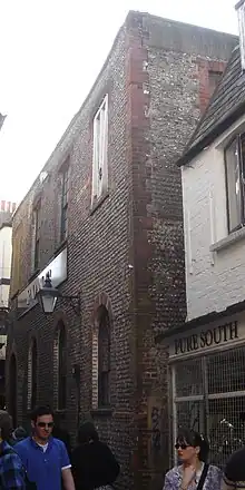 Until that time, St Nicholas' Church was the only place of worship in Brighton.[4] Nationally, only the Church of England was recognised as legitimate. Various Acts of Parliament proscribed Roman Catholic and Nonconformist worship: in particular, the Conventicle Act 1664 prevented groups of non-Anglican Christians meeting for worship.[5][6] By about 1660, however, a Nonconformist community had developed sufficiently to be able to found a school. A religious census carried out in 1676 found 260 Nonconformists,[7] 8% of the village's population of 3,340.[8] As restrictions on their religious practices eased, a chapel was built; this was initially used by Presbyterians.[4] It was built in the heart of the old village on a street which was later named Union Street in reference to the chapel.[5] Sources disagree on the date of its founding and construction. Many identify 1683,[4][9][10][11] others prefer 1698,[5][6][12] and 1688 has also been put forward as the date of construction[13] or the date the land was sold to the Presbyterian community.[5] A foundation stone still exists in the south wall, but its date has been identified as either 1683[11] or 1688.[5]
