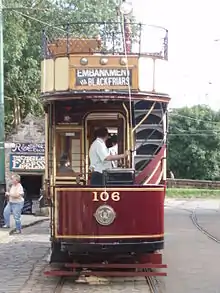 Tram 49 is operated by the Black Country Living Museum. This double decker tram was originally built in 1909 for Wolverhampton Corporation Tramways. It is a typical Edwardian tramcar with an ornate lower saloon and open upper deck with traverse seating. Originally equipped with the Lorain system taking its power supply from studs in the road, it was later converted to run from overhead wires. Preserved in 1976, the tram was painstakingly restored by the Black Country Museum Transport Group over many years and completed in 2004.[4]