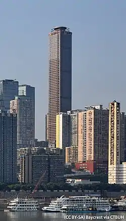 The United International Mansion (Chinese: 重庆联合国际大厦) Construction began in 1998. The building was then to measure 238 meters. Construction was suspended the following year, to resume in 2004, according to new plans; the tower was then to culminate at 289 m. It was again stopped in 2005, to finally restart in 2008, to end up with the current building. Is a late-modernist skyscraper made of reinforced concrete in Chongqing, China completed in 2013.