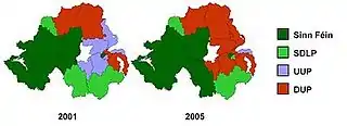 The DUP won the most out of the 2005 parliamentary elections, taking four seats from the UUP to become the largest Northern Irish political party at Westminster. Sinn Féin managed to take Newry and Armagh from the SDLP, though the SDLP did gain South Belfast from the UUP.[14]