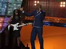 The British performance featured Andy Abraham, dressed in a blue suit with silver elements, performing on a predominately gold and brown coloured stage with the LED screens displaying mutli-coloured sparkling squares.[15] Abraham was joined by a drummer, two guitarists, a keyboardist and a backing vocalist, all dressed in black with the male performers also wearing white ties. The performance also featured pyrotechnic effects.[16][17] The United Kingdom placed twenty-fourth (last) in the final, scoring 14 points.[18]
