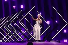 The British performance featured SuRie dressed in a white wide-legged jumpsuit and performing on a predominately blue, purple and white coloured stage which featured a diamond-shaped light tunnel prop. The performance also featured smoke and pyrotechnic effects.[18][19] During the performance, stage invader Dr ACactivism grabbed SuRie's microphone and shouted: "Modern Nazis of The UK media, we demand freedom! War is not peace!", before being removed by security and taken into police custody.[20] The singer, who was without her microphone for about 10 seconds but was nevertheless able to finish her performance, was offered the opportunity to perform again after the entry from Italy by the European Broadcasting Union (EBU), however she declined as her team were "proud of her performance".[21] Three off-stage backing vocalists joined SuRie for the performance and were Charlotte Churchman, Debby Bracknell and Mark De-Lisser. The United Kingdom placed twenty-fourth in the final, scoring 48 points: 25 points from the televoting and 23 points from the juries. During an interview on ITV magazine programme This Morning after the contest, SuRie revealed she had some bruises on her hands where Dr ACactivism had grabbed her and also on her shoulder where he had barged into her, but stated that she had not been seriously harmed by the incident.[22]