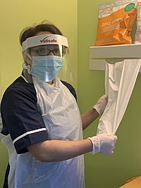 As early as February 2020 frontline healthcare workers began to raise their concern regarding the UK's preparedness to cope with a large-scale outbreak.[11] On 16 March, primary care magazine Pulse reported doctors were receiving out-of-date PPE that had had its 2016 use-by date covered with a sticker saying "2021".[12] In response, the government offered reassurance that this was safe.[13] Earlier in the month, in response to a survey of Pulse's readership, two out of five GPs reported they still did not have PPE to protect them from coronavirus.[12] Some of these concerns were raised with Johnson during Prime Minister's Questions, to which the Prime Minister replied the UK had "stockpiles" of PPE.[14] The same day, the Doctors' Association UK (DAUK) reported NHS staff felt they were being put at risk due to lack of PPE.[15]