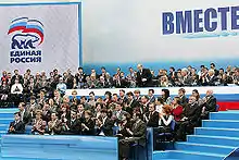 United Russia supports the policies of the incumbent President of Russia, Vladimir Putin, who previously served as party leader during the presidency of Dmitry Medvedev; despite not currently being the official leader or a member of the party, Putin operates as its de facto leader.[24] The party peaked in the 2007 Russian legislative election with 64.3% of the vote, while in recent years, it has seen its popularity decline.[25] The party's ideology has been inconsistent but embraces specific politicians and officials[26] who hold various political views but support Putin.[27] The party appeals mainly to pro-Putin and non-ideological voters[28][29] and is often classified by political scientists as a "big-tent party"[30][31][32][33] or as a "party of power",[34][35][36][37][38][39] meaning that it is the most influential Russian political force that makes major political decisions. In 2009, it proclaimed Russian conservatism as its official ideology.[5][40]