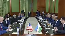 Additionally, Uzbekistan has shown a willingness to liberalize the country through not only domestic reform but also diplomatic visits. President Mirziyoyev met Donald Trump on May 16, 2018 at the White House, becoming the first Uzbek president to officially visit the United States since March 2002.[7] Mirziyoyev's shift towards the United States aligns with his previously mentioned goal of transforming Uzbekistan's economy by developing a strong relationship with United States. This in turn will facilitate the process of obtaining loans in international institutions like the World Bank because of the influence the US holds in these institutions.[7]