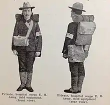 The Hospital Corps as created in 1886 was to be composed of Hospital Stewards, Acting Hospital Stewards and Privates, the number of which were to be decided by the Secretary of War. Enlisted men not belonging to the Corps would not be detailed to medical service. The members of the Corps would perform all enlisted medical services in hospital and in the field.[12] In 1896 the Congress fixed the number of hospital stewards to 100. The Corps then had about 100 acting hospital stewards and about 500 privates.[13] In 1901, the rank of Lance Acting Hospital Steward was given to prospective hospital stewards during a probationary period, and in 1903 the rank of Corporal was introduced; specifically created for those men who were good leaders but unable to pass the required examinations for promotion.[14] In 1903, the ranks of the hospital stewards were put in line with the rest of the army; Hospital Stewards becoming Sergeants First Class, Acting Hospital Stewards becoming Sergeants, Lance Acting Hospital Steward becoming Lance Corporals.[15] By 1909, the rank of Private First Class had been introduced, in the proportion not exceeding one to two privates. The Corps then had 300 sergeants first class, 300 sergeants and 20 corporals.[16] The largest strength of the Corps occurred during the Spanish–American War; in June 1898 it contained 133 hospital stewards, 172 acting hospital stewards and 2,940 privates. The peak was reached in November the same year with about 6,000 men serving in the Corps, although about 22,500 were needed.[17][18]