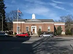 The US Post Office-Lexington Main is a historic post office at 1661 Massachusetts Avenue in Lexington, Massachusetts. The single-story brick Georgian Revival building was built in 1937 as part of a Depression era works program. The building has fairly modest styling: it has a belfry and cupola, and its entry is flanked by fluted engaged columns, and topped by a simple entablature, and an eagle set in a carved recess. The interior has marble terrazzo flooring, and marble wainscoting below otherwise plaster walls.[2]