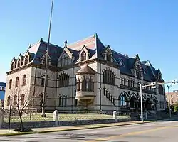 The Evansville Post Office is a three-story, Ruskinian Gothic style limestone building over a basement. It features a front arcade, oriel window, slate roof, and contrasting brownstone details. The building was designed by architects and engineers in the Office of the Supervising Architect under Alfred B. Mullett and William Appleton Potter, with significant revisions by Potter to Mullett's Second Empire design. Construction began under Potter in 1876, and was completed by his successor, James G. Hill, in 1879.[2] The building originally housed facilities for the United States Post Office, the United States District Court for the District of Indiana, the United States Customs Service, the United States Weather Bureau, and other agencies, though several of these would later move to other locations.[2] In 1918 the building was extended with flanking wings in a style matching the original.[3]