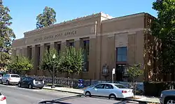 The U.S. Post Office, also known as the Napa Franklin Station, served the 94559 zip code area of Napa, California. The post office was built in 1933 with funding from the Public Works Administration. Architect William H. Corlett designed the Art Deco building. The front facade of the building has three sections; the central section has six bays divided by piers with terra cotta capitals. A terra cotta cornice adorned with ram and cow heads tops the central section. The side sections, which contain the building's two entrances, feature panels with decorative eagle designs above the doorways and urn-shaped bronze light fixtures on either side. The post office's lobby features a painted bas-relief plastic ceiling, unusual in federally constructed post offices, and a terrazzo floor.[2]
