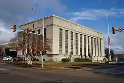 The United States Post Office and Courthouse in Meridian, Mississippi was built in 1933. It was listed on the National Register of Historic Places in 1984. It is a three-story limestone building built in a classical Art Deco style which was home to Meridian's main post office and a federal courthouse from its construction in 1933 until 2012 when the federal courthouse was closed due to budget cuts. The building itself is still open and still houses the post office.
