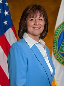 The United States secretary of energy is the head of the United States Department of Energy, a member of the Cabinet of the United States, and fifteenth in the presidential line of succession. The position was created on October 1, 1977, when President Jimmy Carter signed the Department of Energy Organization Act, establishing the department.[2] The energy secretary and the department originally focused on energy production and regulation. The emphasis soon shifted to developing technology for better and more efficient energy sources, as well as energy education. After the end of the Cold War, the department's attention also turned toward radioactive waste disposal and the maintenance of environmental quality.[3] Former secretary of defense James Schlesinger served as the first secretary of energy. As a Republican nominated to the post by Democratic president Jimmy Carter, Schlesinger's appointment marks the only time a president has chosen a member of another political party for the position. Schlesinger is also the only secretary to be dismissed from the post.[4] Hazel O'Leary, Bill Clinton's first secretary of energy, was the first female and first African American to hold the position.[5] The first Hispanic to serve as Energy Secretary was Clinton's second energy secretary, Federico Peña.[6] Spencer Abraham became the first Arab American to hold the position on January 20, 2001, serving under the administration of George W. Bush. Steven Chu became the first Asian American to hold the position on January 20, 2009, serving under president Barack Obama. Chu was also the longest-serving secretary of energy and the first individual to join the Cabinet after having received a Nobel Prize.[7]