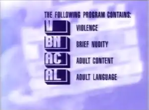 On June 10, 1994, the Home Box Office and Showtime Networks services introduced a revised, uniform system: a set of block icons incorporating one of ten content codes—each two to three letters in length, and displayed in bold Fixedsys type—was added to supplement the applicable descriptive text, which was uniformly featured in a separate "page" of the rating bumper. (Since Home Box Office Inc. adopted the practice in 2015, most premium services—save for the Showtime Networks, which previously used the style from June 1994 to March 1995—have used a bumper format displaying the age-based rating, content advisories and audio/visual accessibility features on a single page.) Under the new system, each advisory label was placed into one of four categories: violence (“MV” for “mild violence”, “V” for “violence”, “GV” for “graphic violence” and “RP” for “rape”), suggestive or explicit sexual material (“BN” for brief nudity”, “N” for “nudity” and “SC” for “strong sexual content”), profane language (“AL” for “adult language” and “GL” for “graphic language”) and a generalized descriptor for mature material that does not fit into the other categories (“AC” for “adult content”).[6][7] Of the participating pay services, Showtime Networks was the only member in the cooperative to have its continuity announcers read the advisory ratings, in addition to the then-commonplace announcement of the program ratings, utilizing such announcements during ratings bumpers until the Fall of 1997.[8][9]