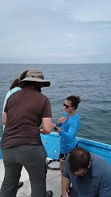 Students and faculty making physical and biological measurements aboard the University of Georgia Marine Institute's research vessel, Spartina